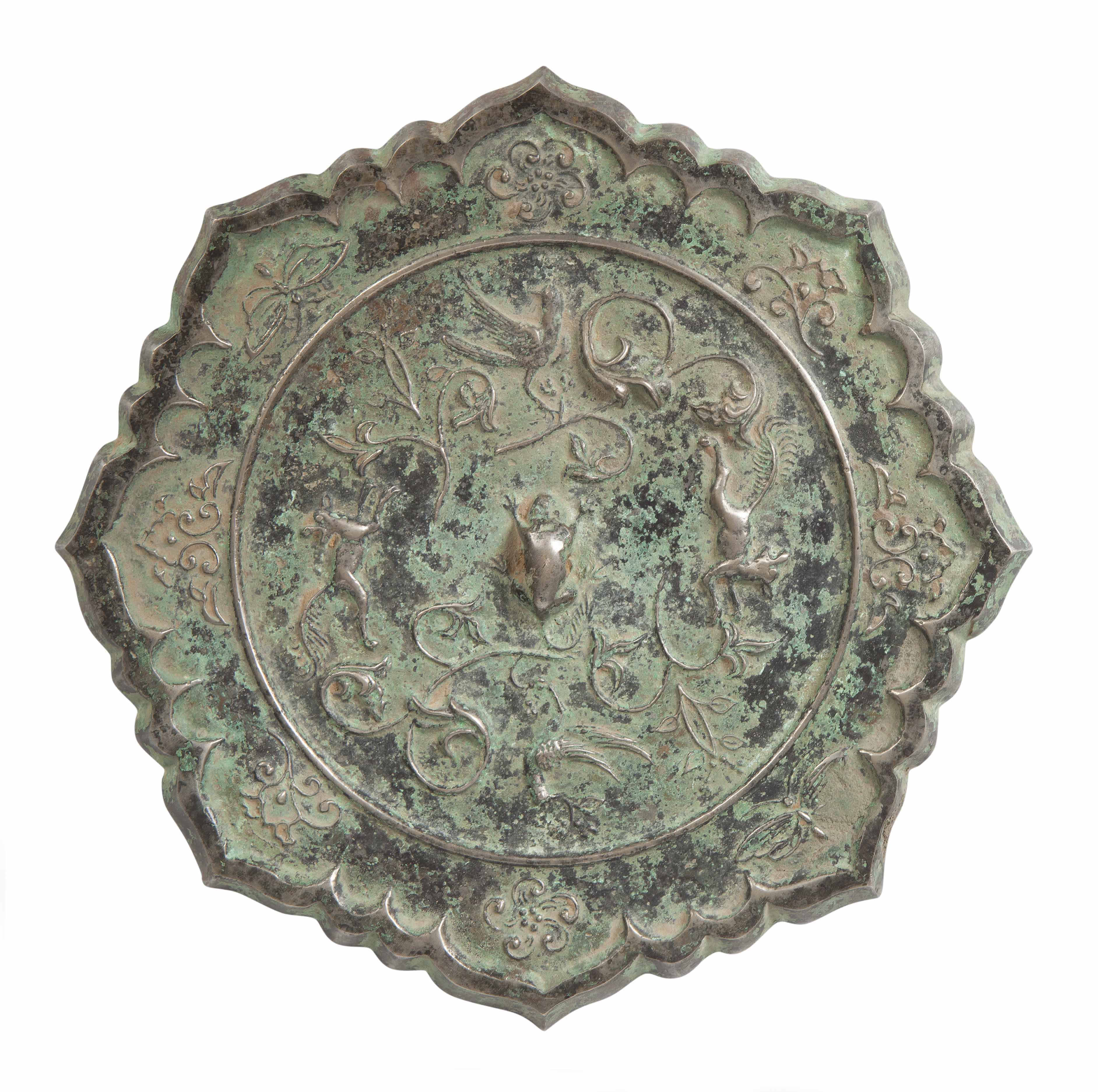 of lobed outline, cast in relief with a crouching lion central knop, surrounded by two further lions and two pheonix birds, within vines and flowerhead motifs