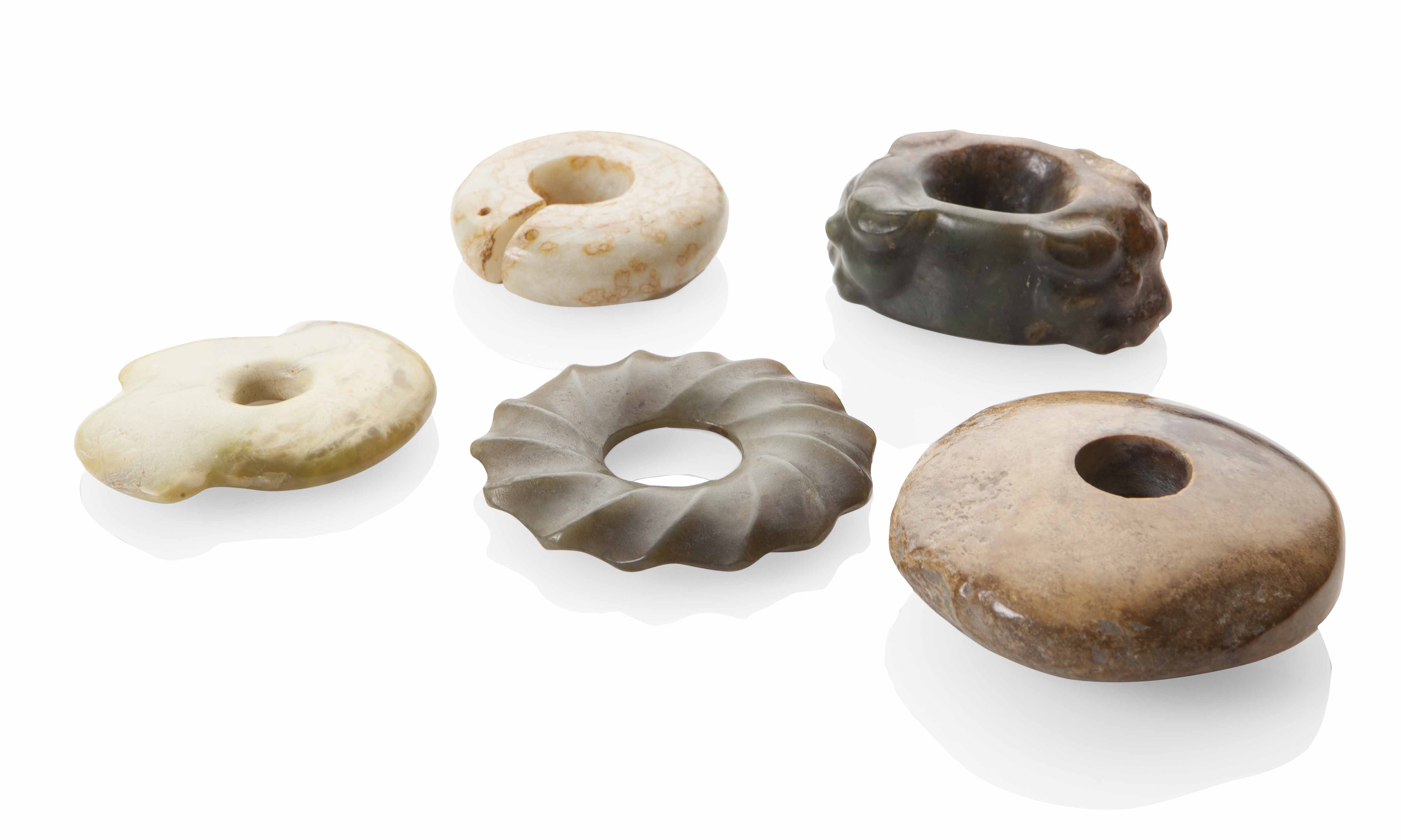 comprising; three Bi discs, a Jue and an animal mask carved object (5)
