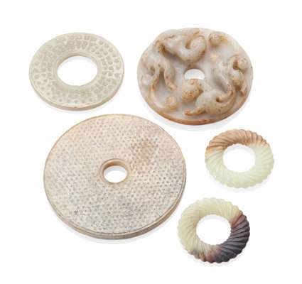 carved in relief with two chilong, the reverse with rows of low relief spirals, 7.5cm diam; together with FOUR OTHER JADE BI DISCS (5)