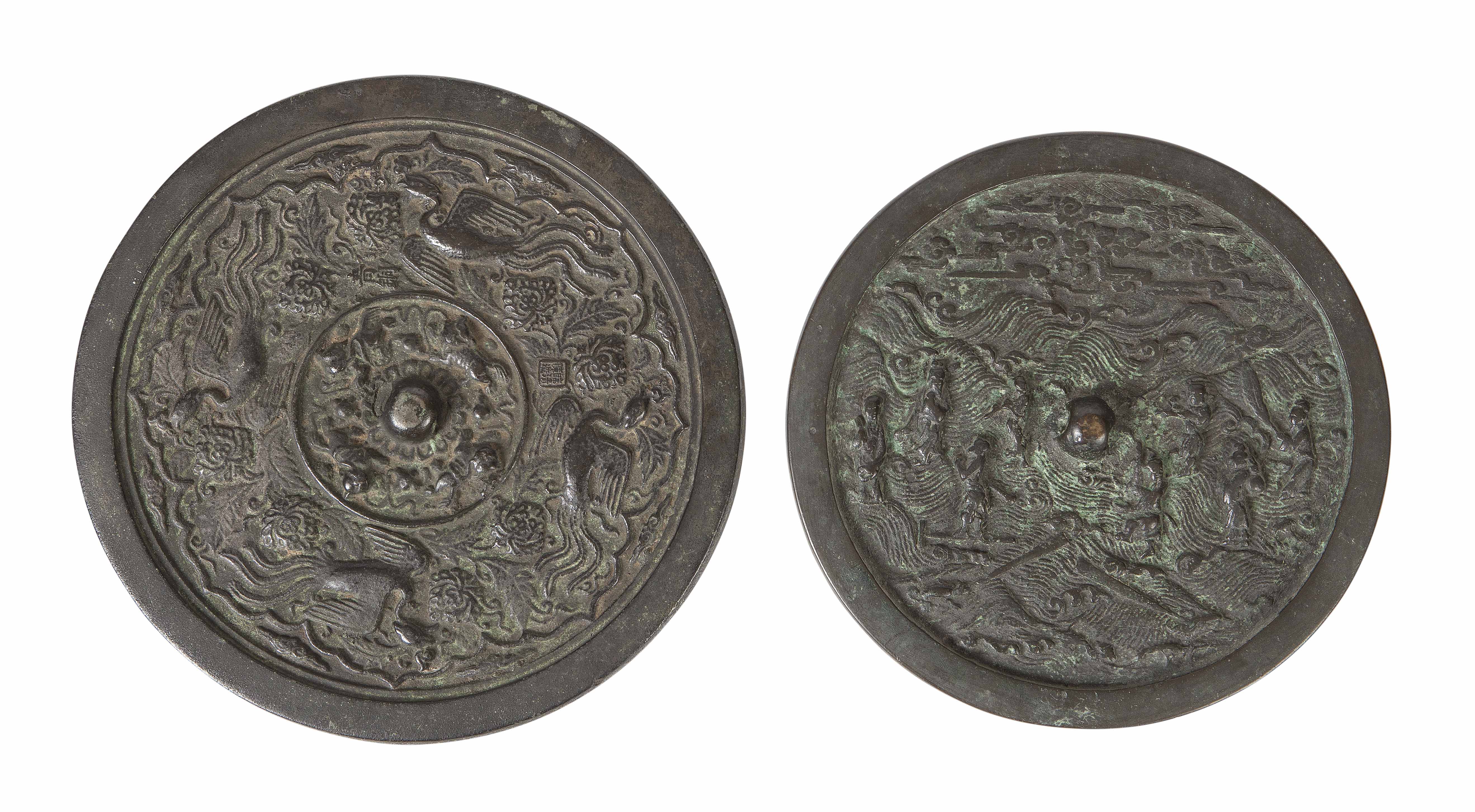 each cast in relief, one with lions and pheonix, inscribed 'made by Chen from Lin Qing', the other with the Eight Immortals (2)