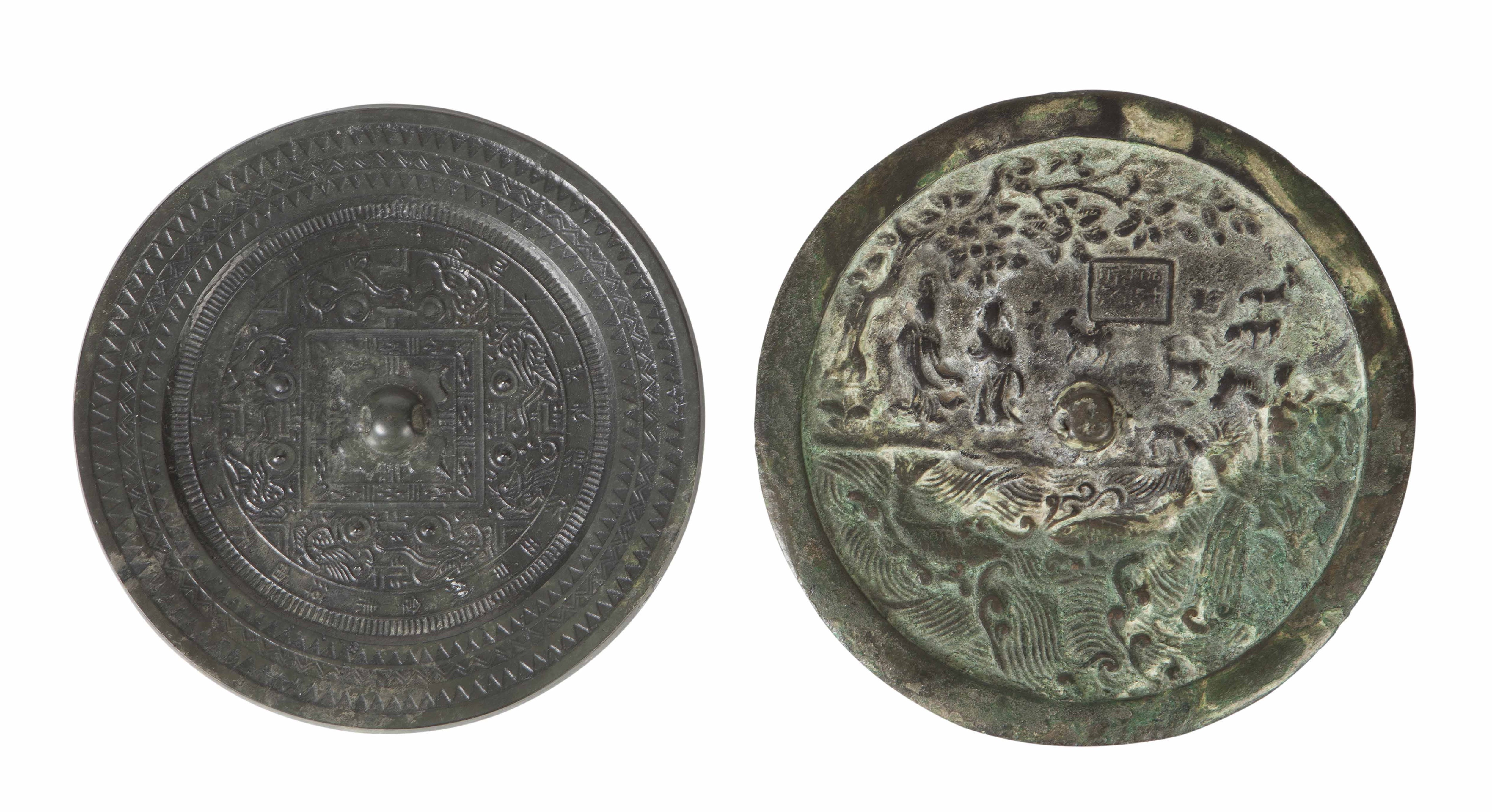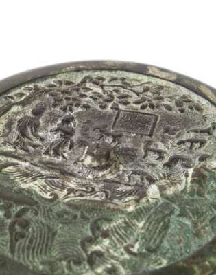 cast in relief with figures and goats beneath a tree, with fish swimming beneath, bears inscription, 17cm diam; together with a HAN-STYLE BRONZE MIRROR (2)