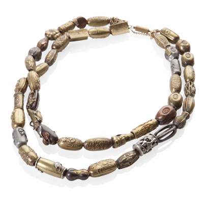 consisting of 46 silver, brass or copper beads carved in relief with flower and animals