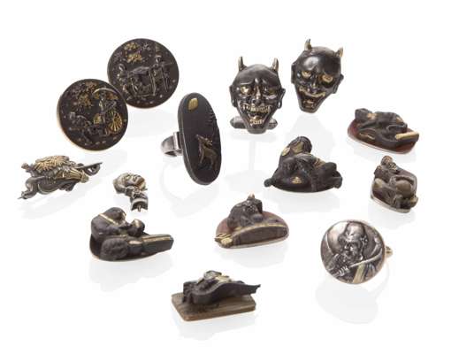 the cufflinks carved with Hannya masks or figural scenes, highlighted in gold; together with TWO RINGS; a BROOCH; and SEVEN MENUKI (14)