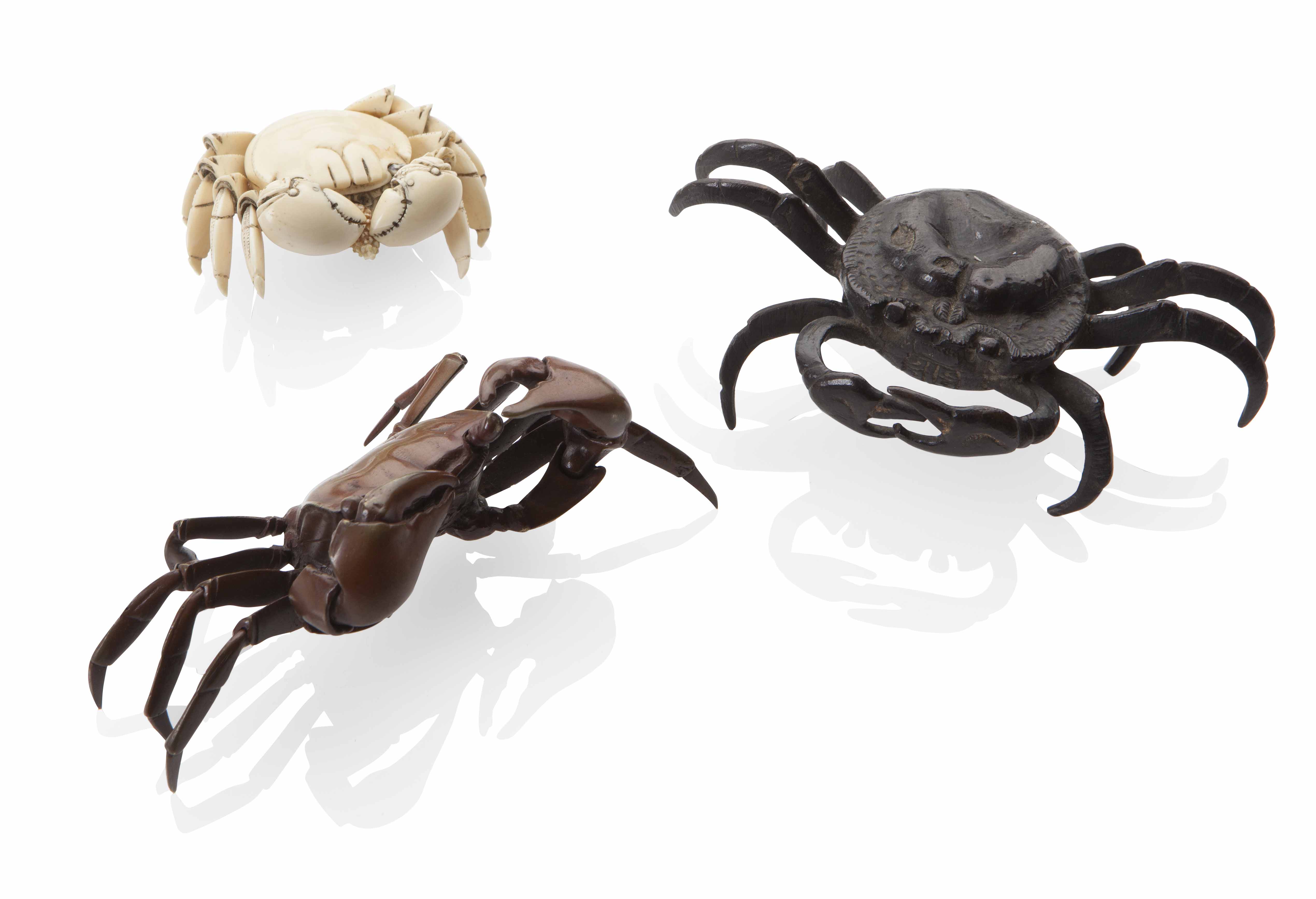 together with a CHINESE IVORY SNUFF BOTTLE IN THE FORM OF A CRAB; and another JAPANESE BRONZE CRAB (3)