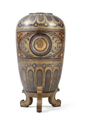 decorated with floral lappets and flower-heads in medallions, gilt and painted, raised on three supports, signed Yoshiaki to the bottom