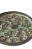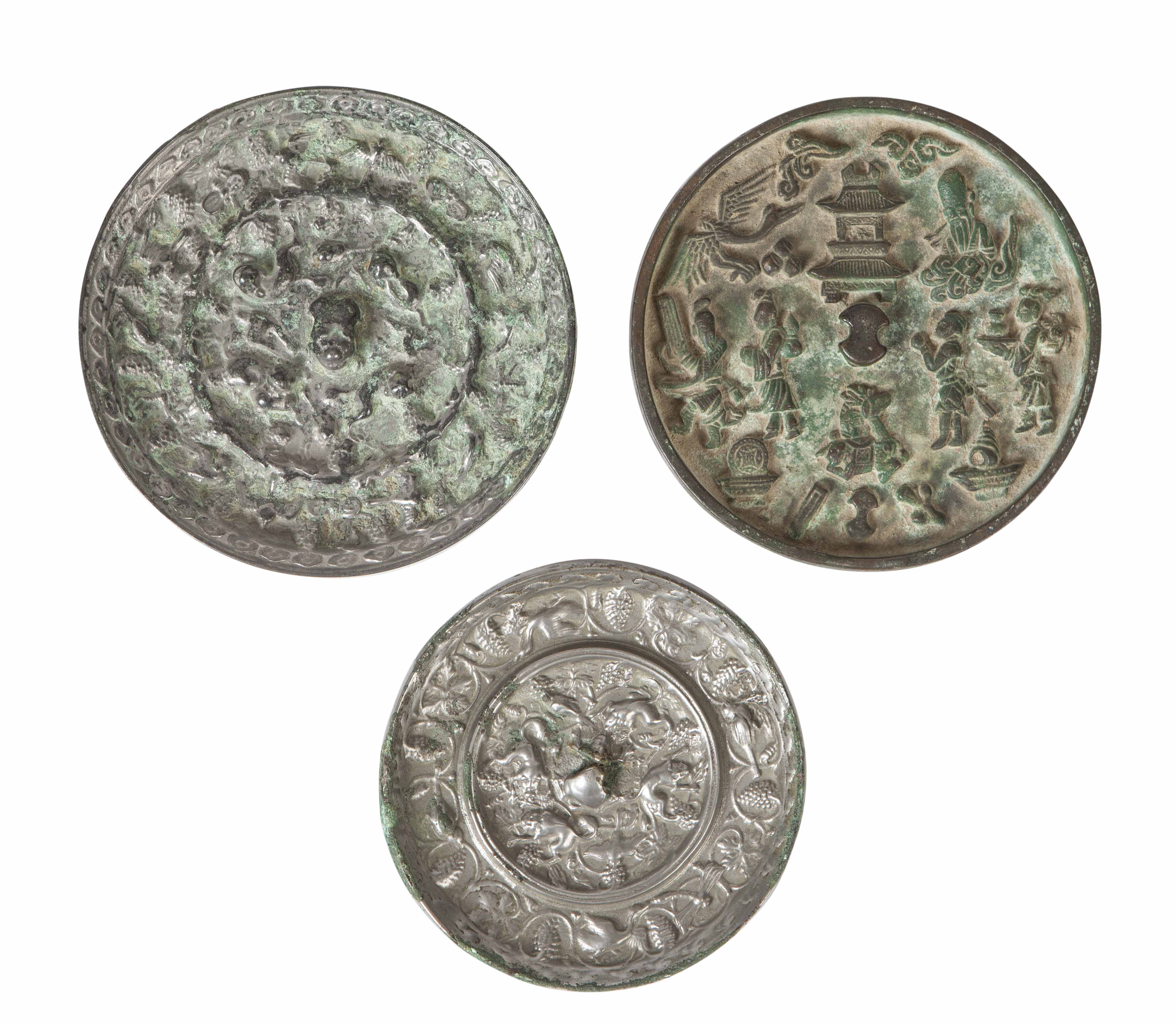 cast in relief with a central lion knop surrounded by four further lions and a band of birds, within fruiting vines, 11cm diam; together with ANOTHER SIMILAR, smaller; and a BRONZE MIRROR, LATE YUAN/EARLY MING DYNASTY, cast in relief with figures, 10.5cm diam (3)