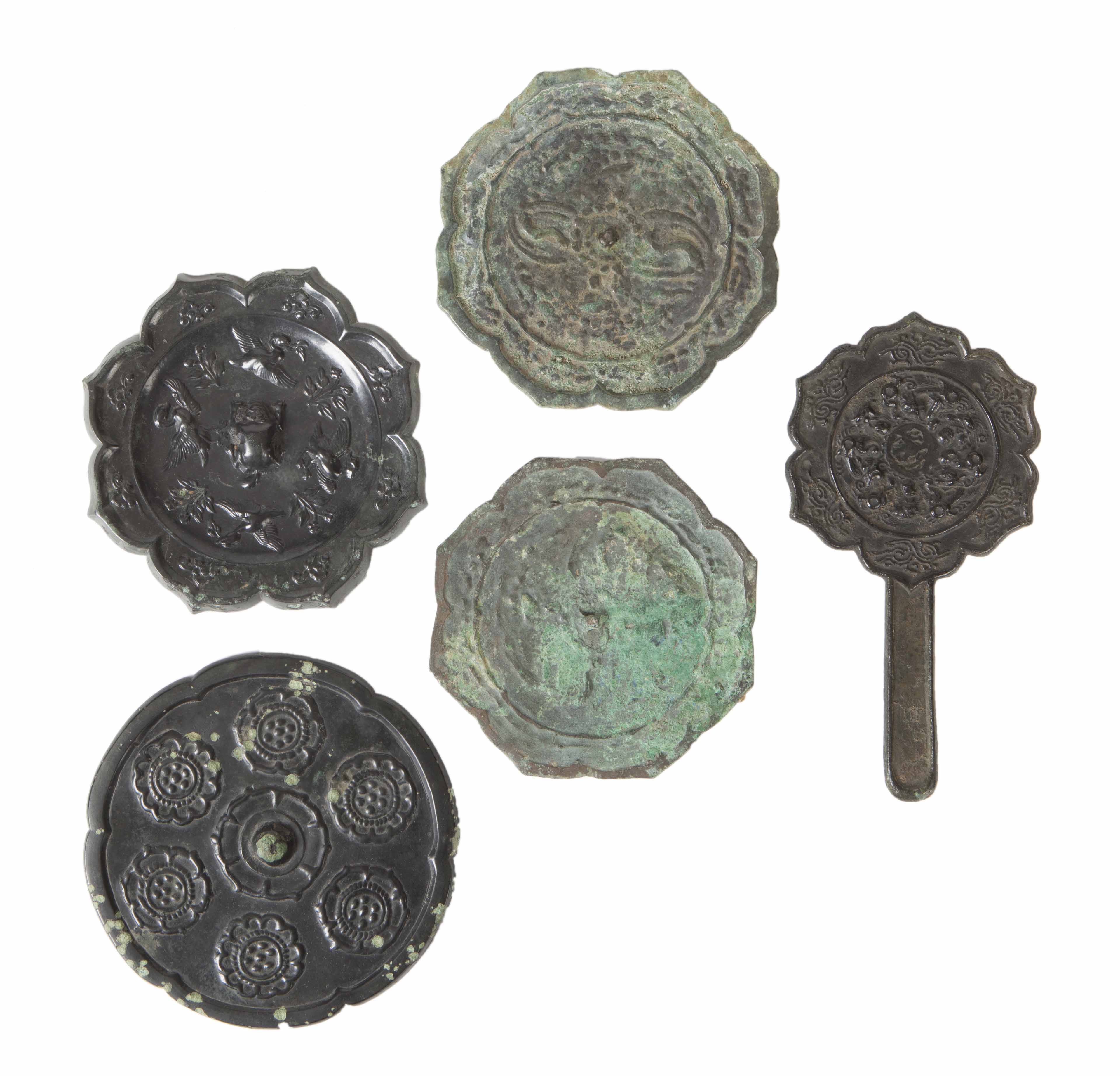 cast in high relief with a central lion knop surrounded by birds with sprays of flowers, 13cm diam; together with a BRONZE HAND MIRROR, MING DYNASTY and three BRONZE HAND MIRRORS (5)