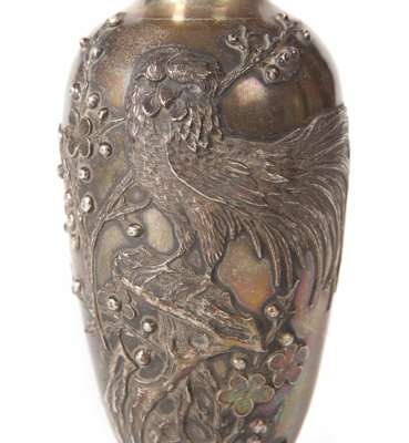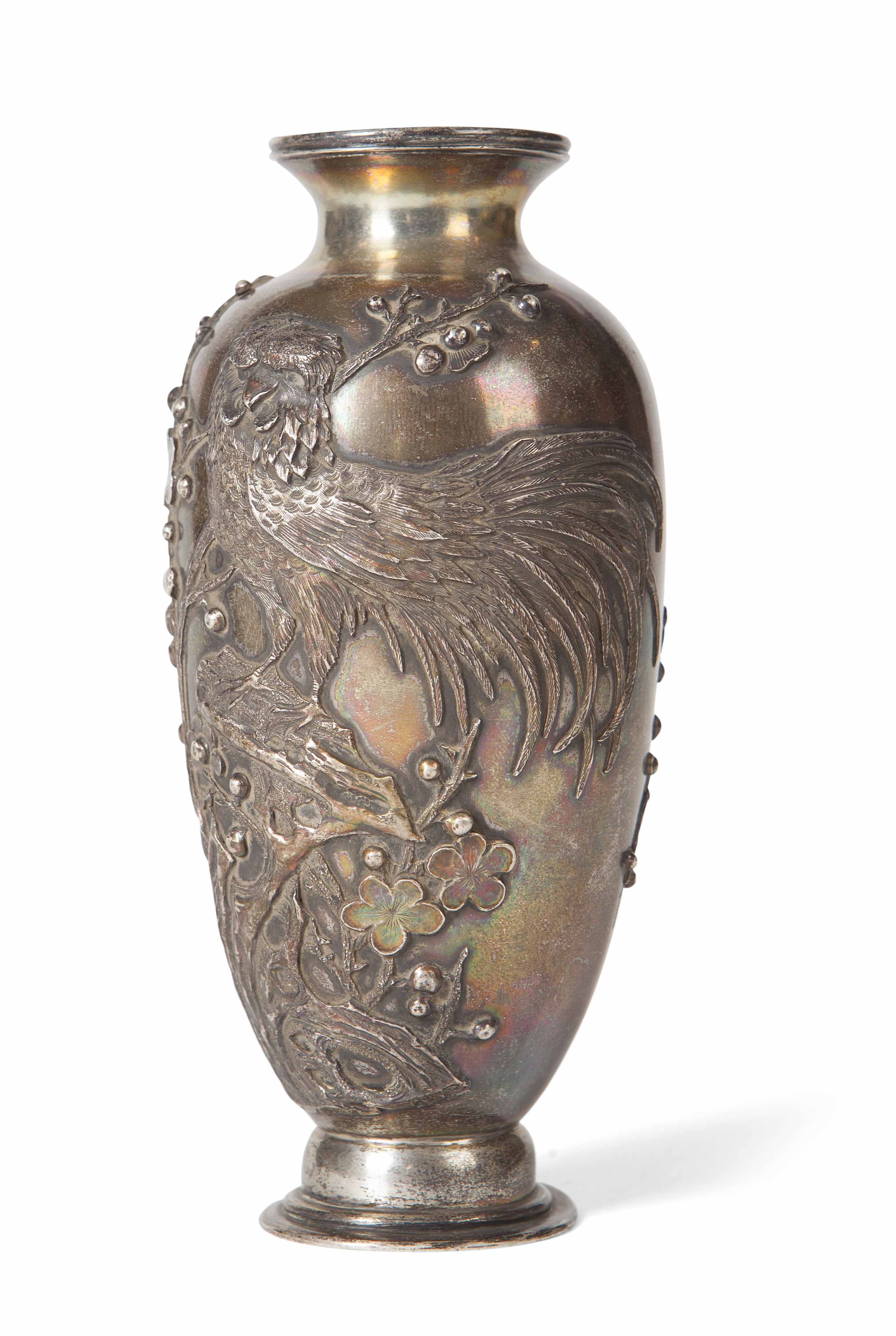 The sides finely chased and embossed with a cockerel perched within blossoming branches
