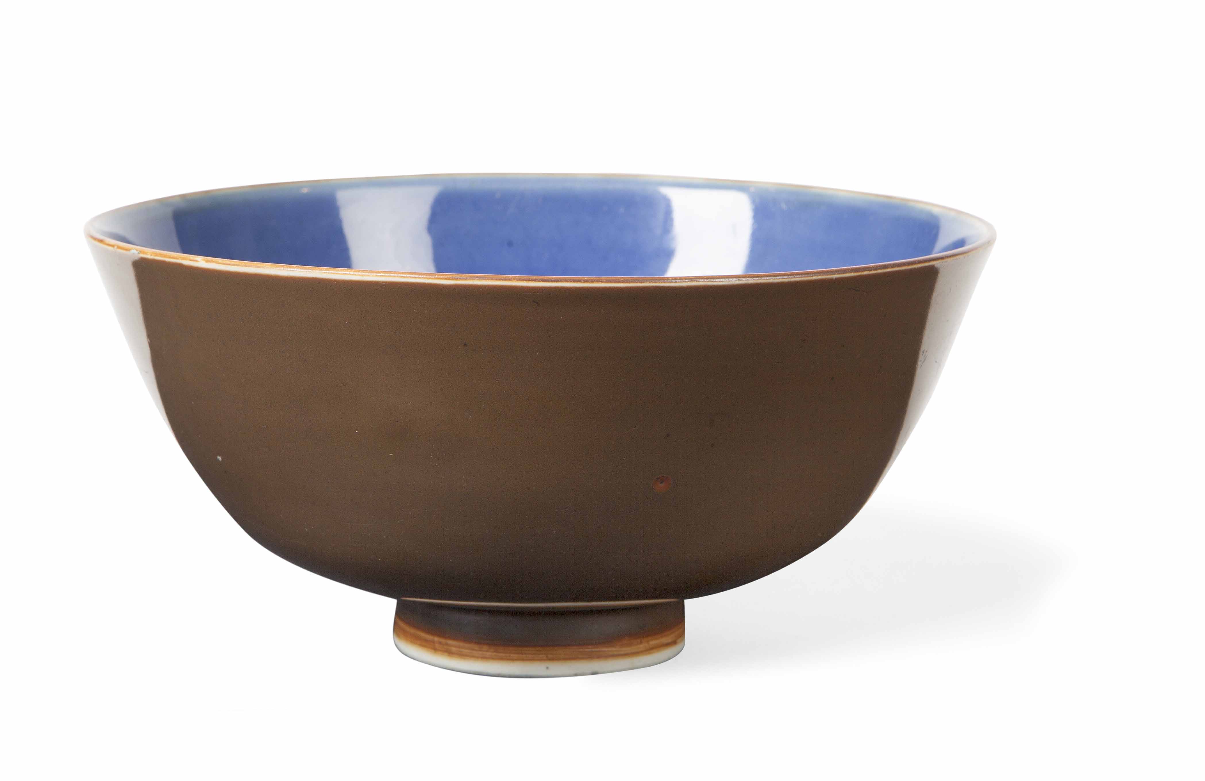 the rounded sides ending on a tall circular foot, the interior covered in rich blue glaze and the exterior in café-au-lait glaze