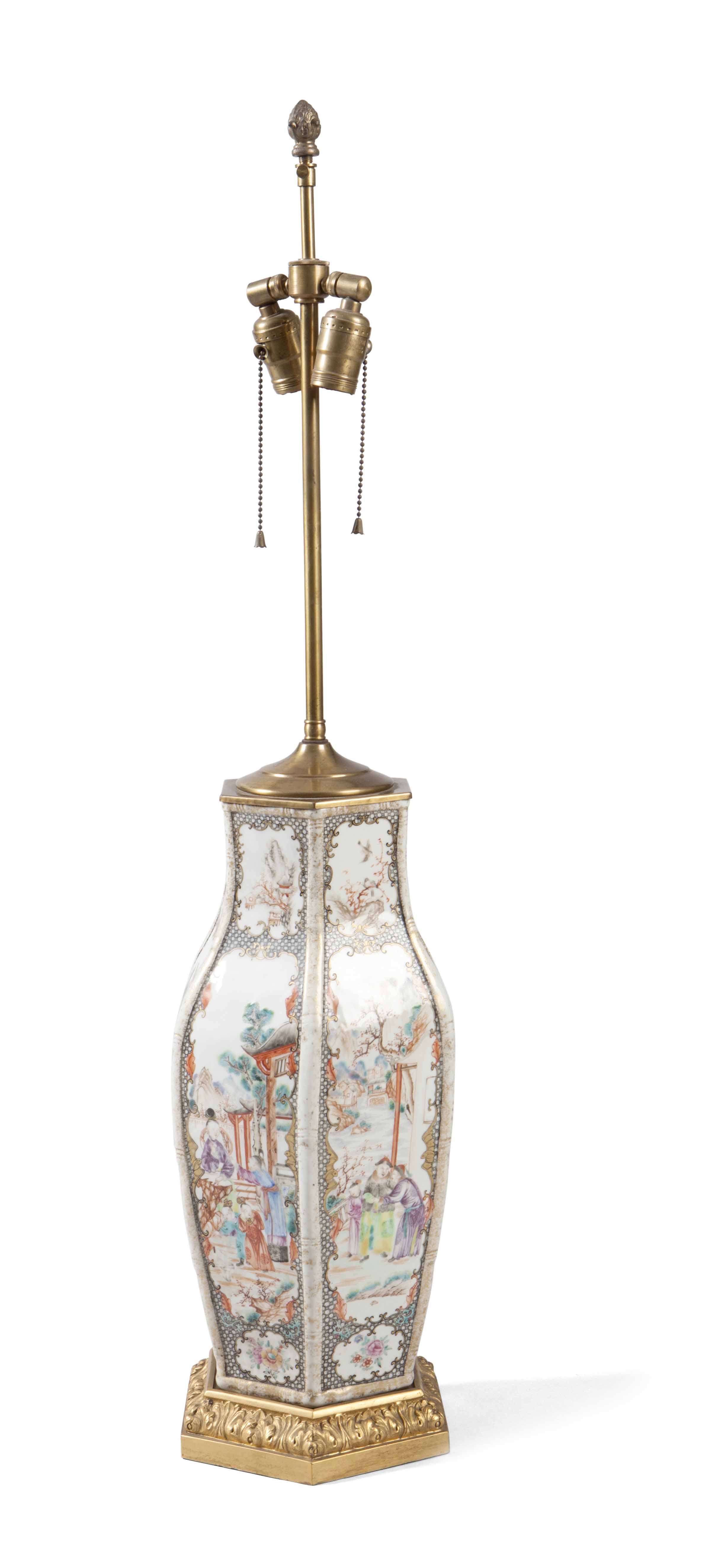 of hexagonal baluster form, the body with floral diaper pattern, the gilt floral decoration around each panel enclosing elaborate cartouches depicting scenes of daily court and village life, the smaller cartouches depicting birds, flowers and landscapes, fitted as a lamp