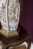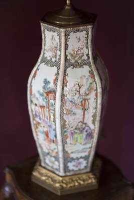 of hexagonal baluster form, each side with elaborate cartouches depicting scenes of daily court and village life, a wild mountainous landscape in the background, the smaller cartouches depicting birds, flowers and landscapes, the body with floral diaper pattern, fitted as a lamp