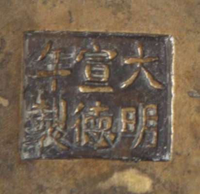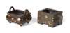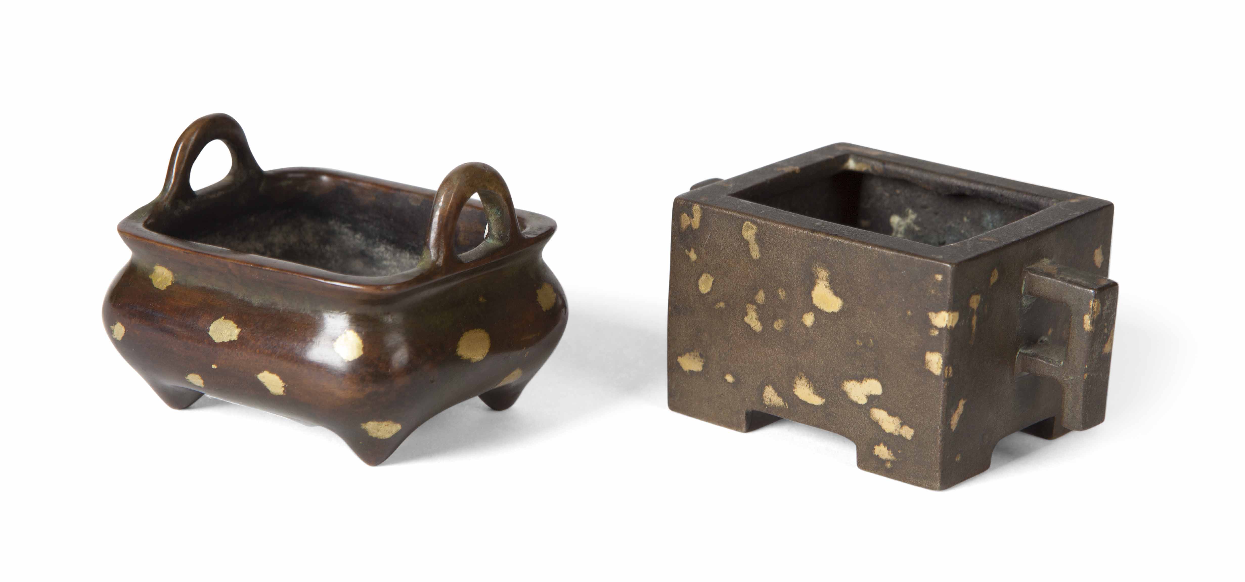 the compressed square sides with twin scroll handles and raised on four feet, 5cm wide; together with another small BRONZE GOLD SPLASH CENSER, XUANDE MARK BUT 18TH CENTURY, in the archaic style, 7cm wide (2)