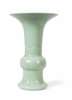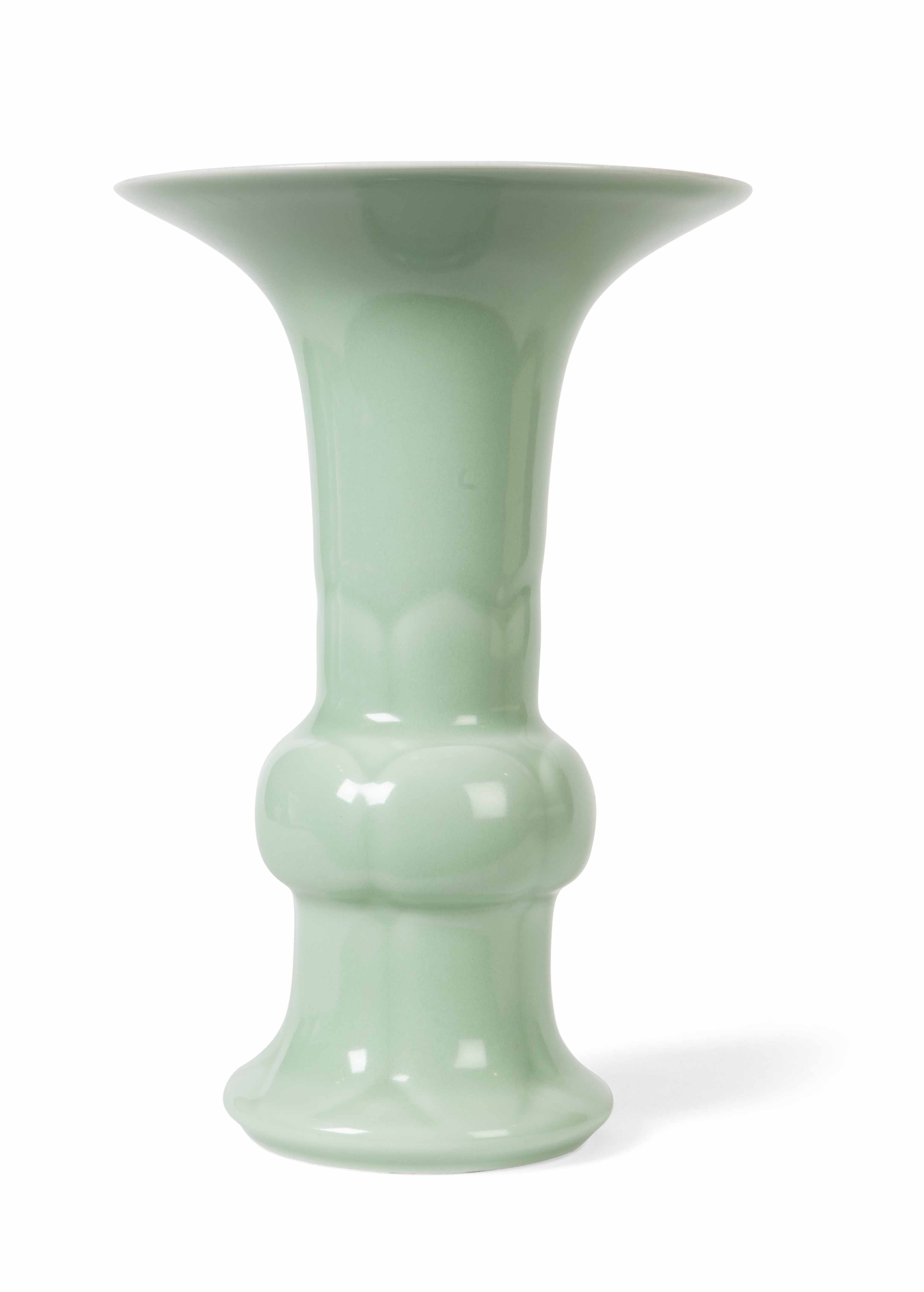 the body of slender cylindrical form rising from a short spreading foot to a trumpet neck and mouth, with bulbous mid-section to the lower body, and moulded with petal-form design