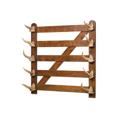 carved with oak leaves and shield; together with an ANTLER MOUNTED SLATTED OAK COAT RACK
