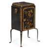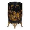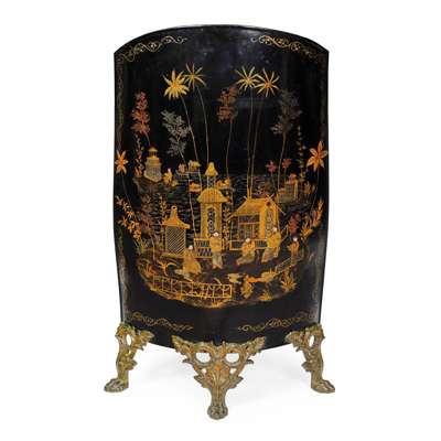 of convex form, depicting figures and buildings, raised on gilt metal feet, terminating in lion’s paw feet; together with a TOLE PLATE WARMING CABINET, on cabriole legs