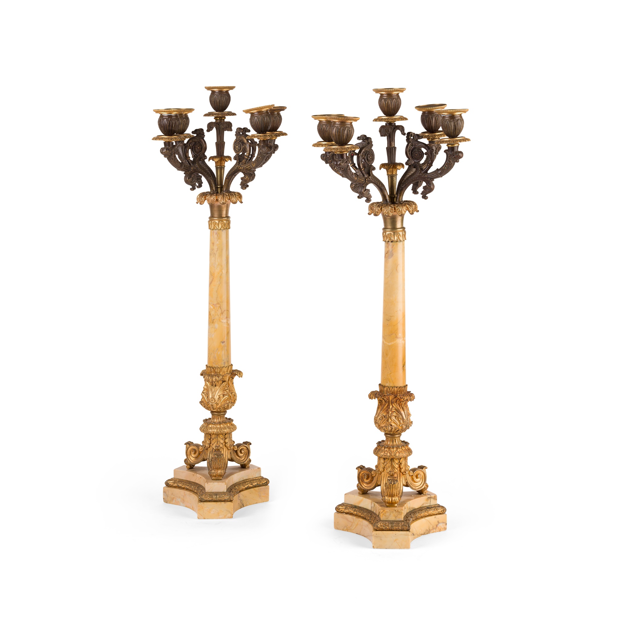 PAIR OF REGENCY SIENA MARBLE AND BRONZE CANDELABRA