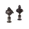 dark brown patina, each with head and shoulders raised on circular marble bases with bronze plaques