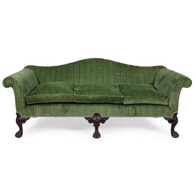 with a hump back, in green plush upholstery, raised on short cabriole legs and hairy paw feet