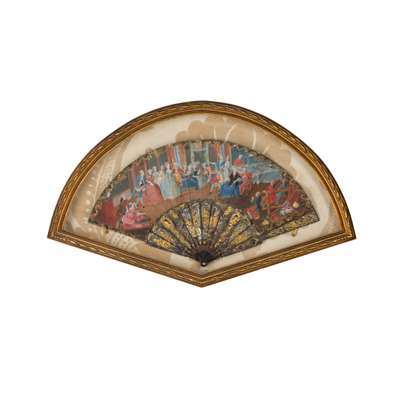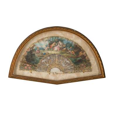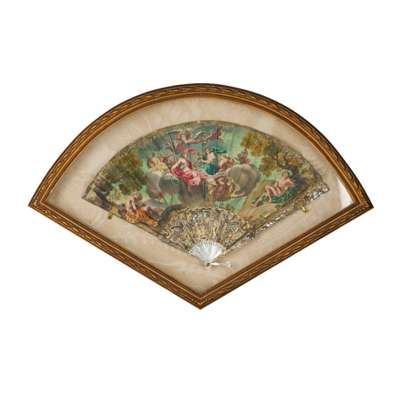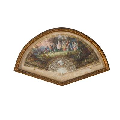 with mother-of-pearl and ivory sticks, the fans painted prints depicting figures in landscapes and classical scenes, in gilt wood glazed frames