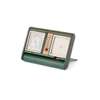 the rounded rectangular case with rounded edges and swivelling to form a stand showing a barometer, thermometer, and alarm clock, mounted in white metal, gilt initials