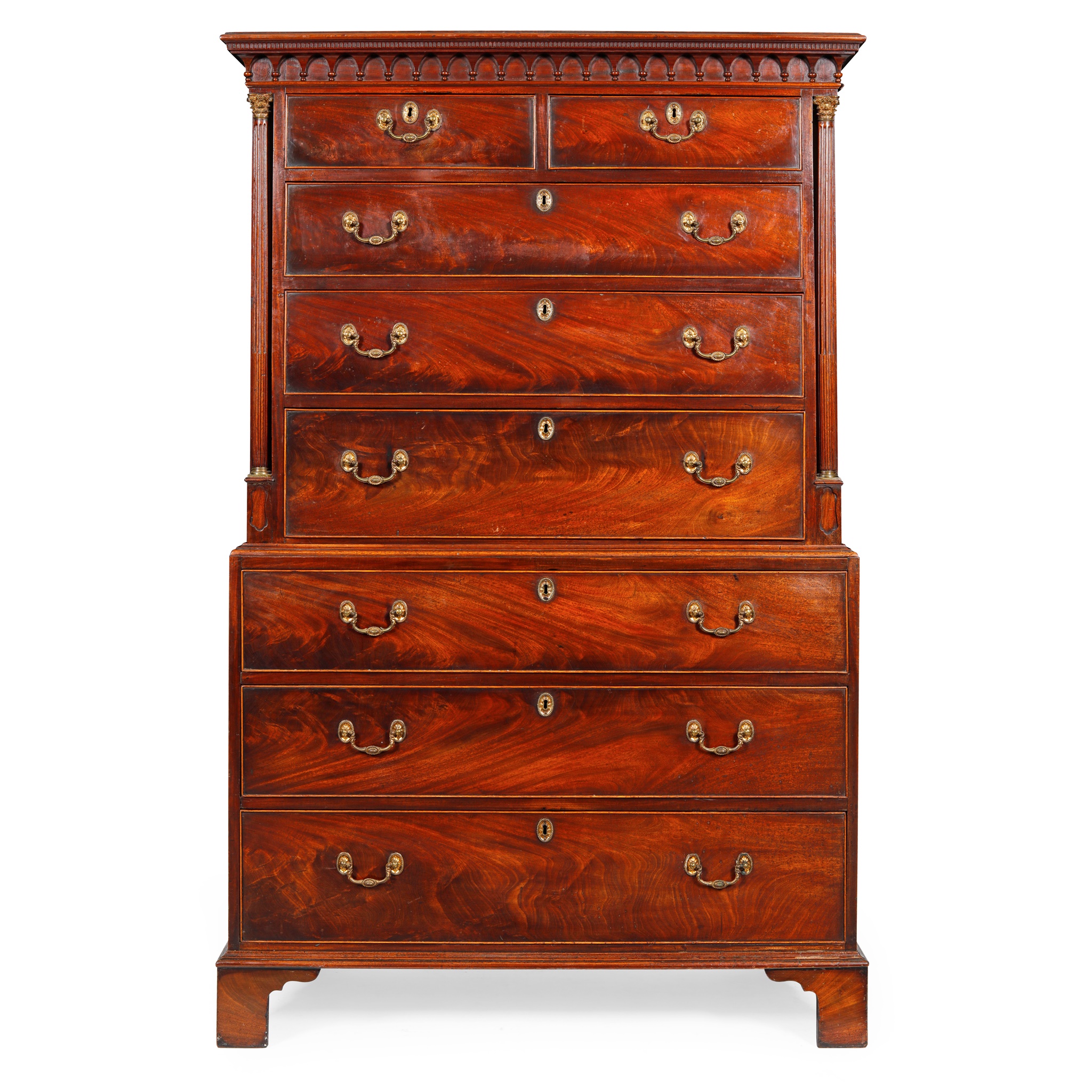the dentil moulded cornice above a lancet moulded frieze, above two short and three long graduated drawers flanked by fluted corner columns with gilt metal Corinthian capitals, the base with three further long drawers, raised on bracket feet