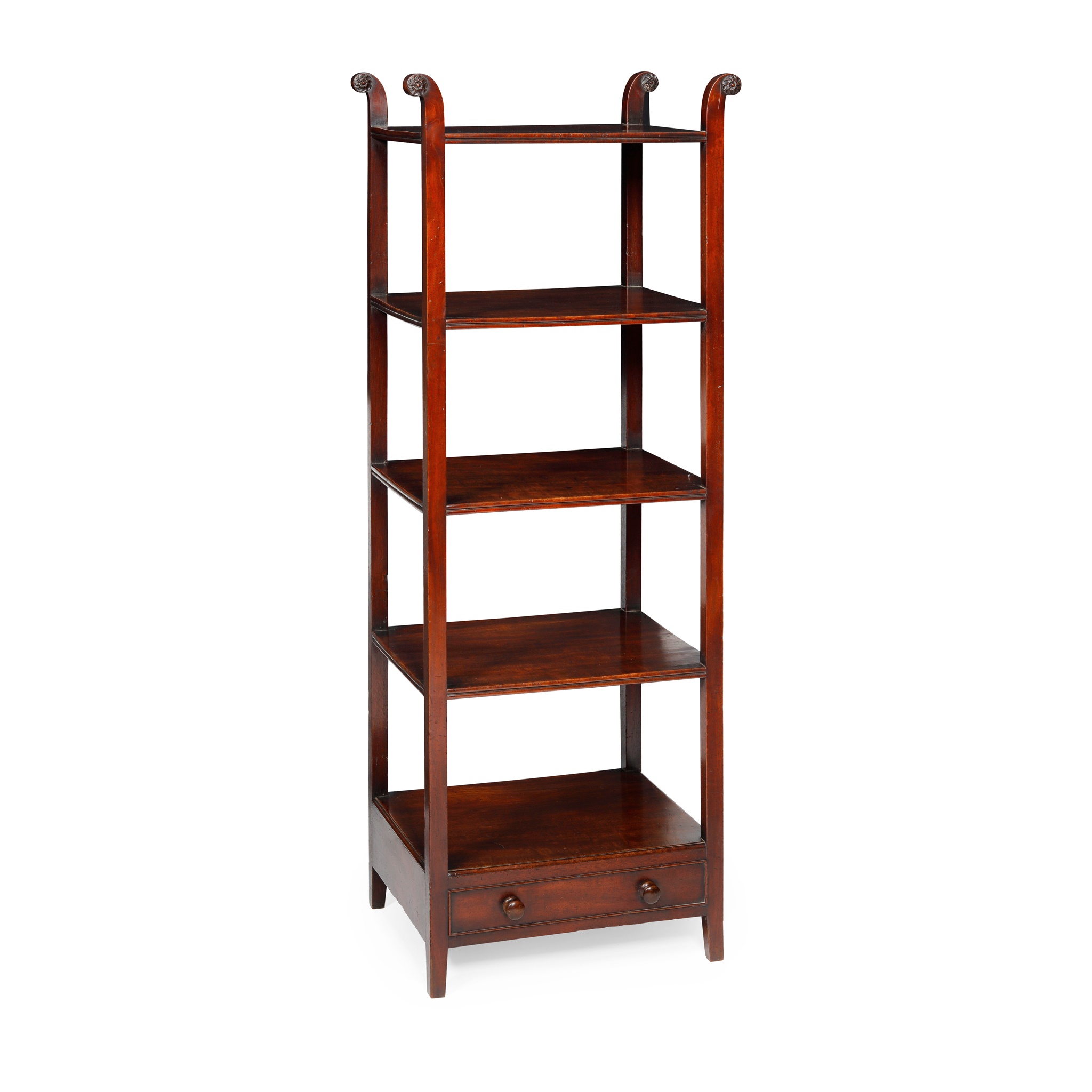 the four tiers with reeded edge, the outscrolled corner finials to the supports carved with rosettes and a false drawer to the base