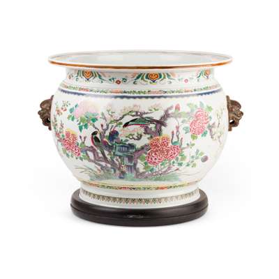 flattened rim, rounded body, decorated with exotic birds and flowers, unglazed lion head handles