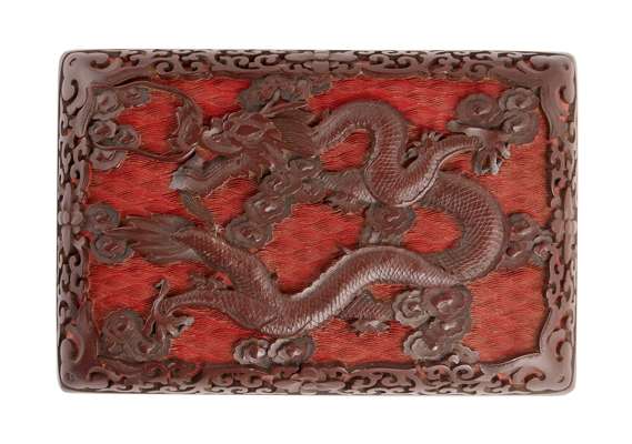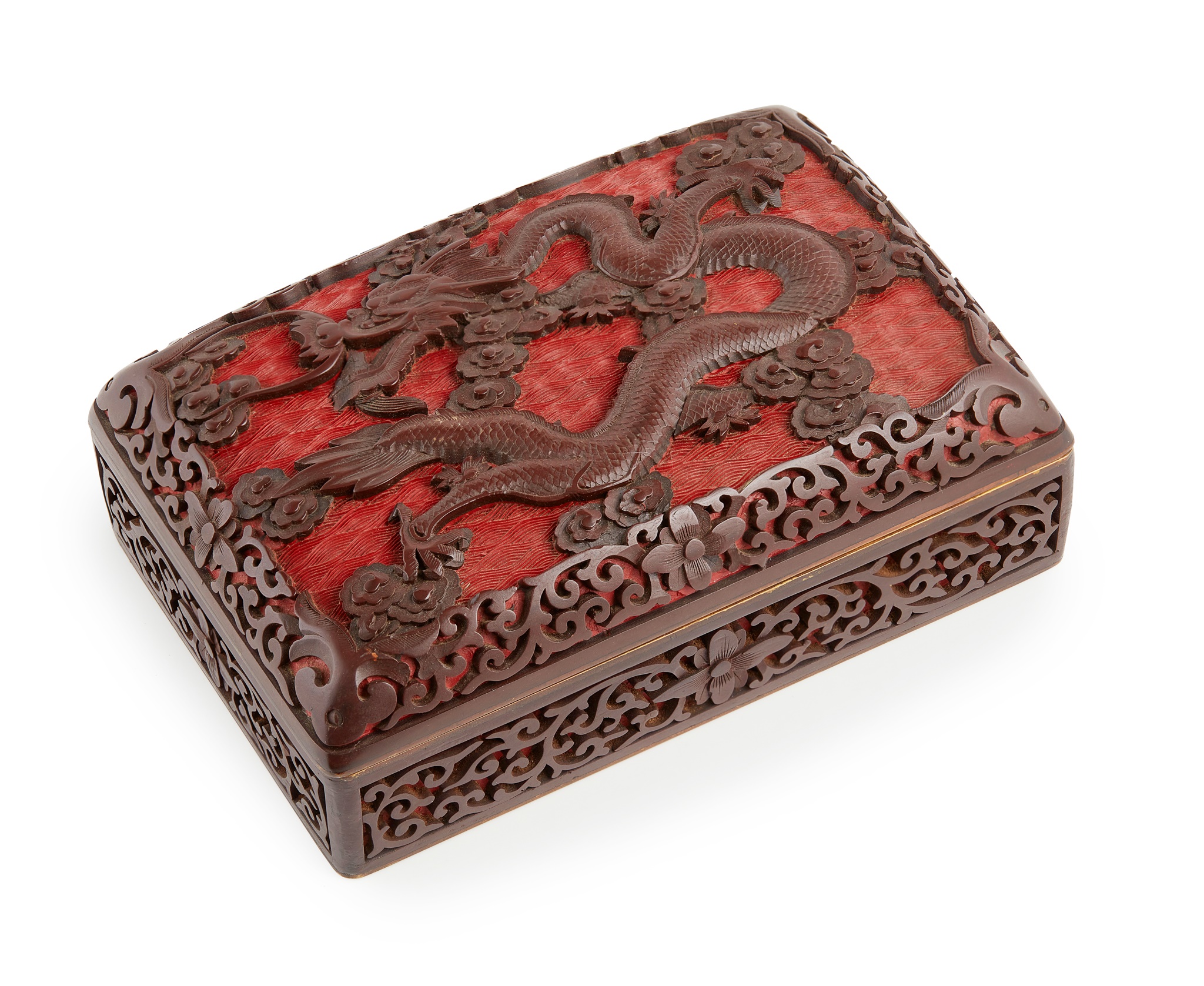 the lid carved in relief with a dragon surrounded by auspicious clouds, the interior and underside of the lid with blue enamel