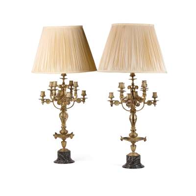 with eight outscrolled arms each, on veined marble bases, converted to table lamps; with pleated shades