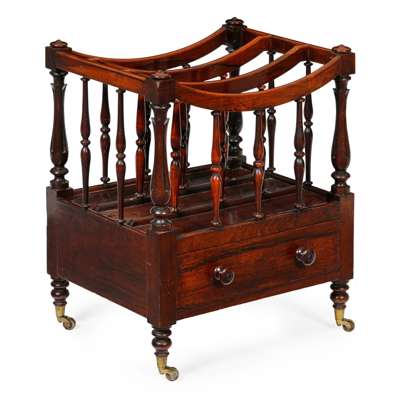 with three divisions and a drawer to the base, on turned tapering legs, caps and castors