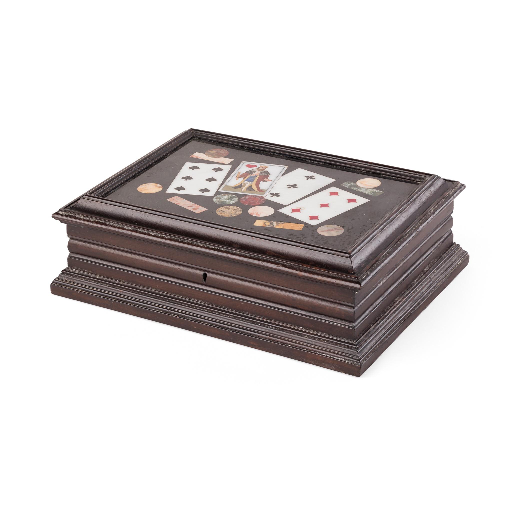 PIETRA DURA MARBLE AND EBONISED WOOD GAMES BOX