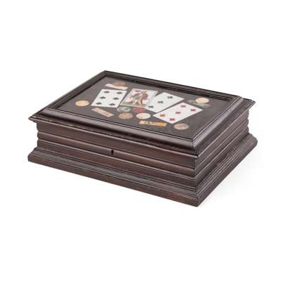 the rectangular top with inlaid cards and counters, opening to a fitted interior, raised on a moulded plinth base