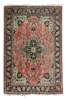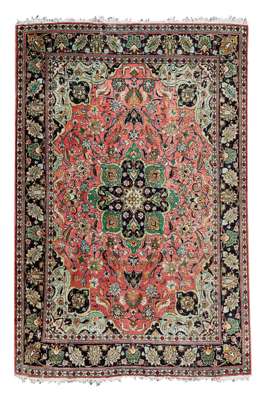 the salmon pink field with green and indigo medallion, similar spandrels, within indigo palmette and vine border