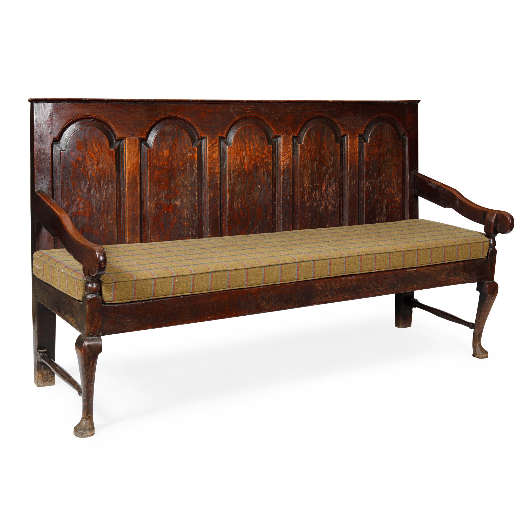 the rectangular back with five arched fielded panels, downswept arms, on front cabriole legs