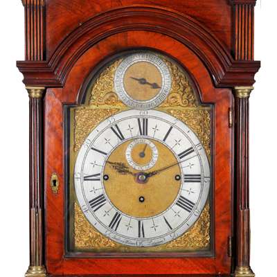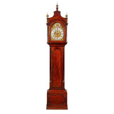 with pagoda top, brass ball finials, arched brass dial, silvered chapter with subsidiary second and date dials, signed, stop fluted pilasters, brass inlay, moulded arched trunk door, brass stop fluted quarter columns, moulded base and plinth, chimes on four bells