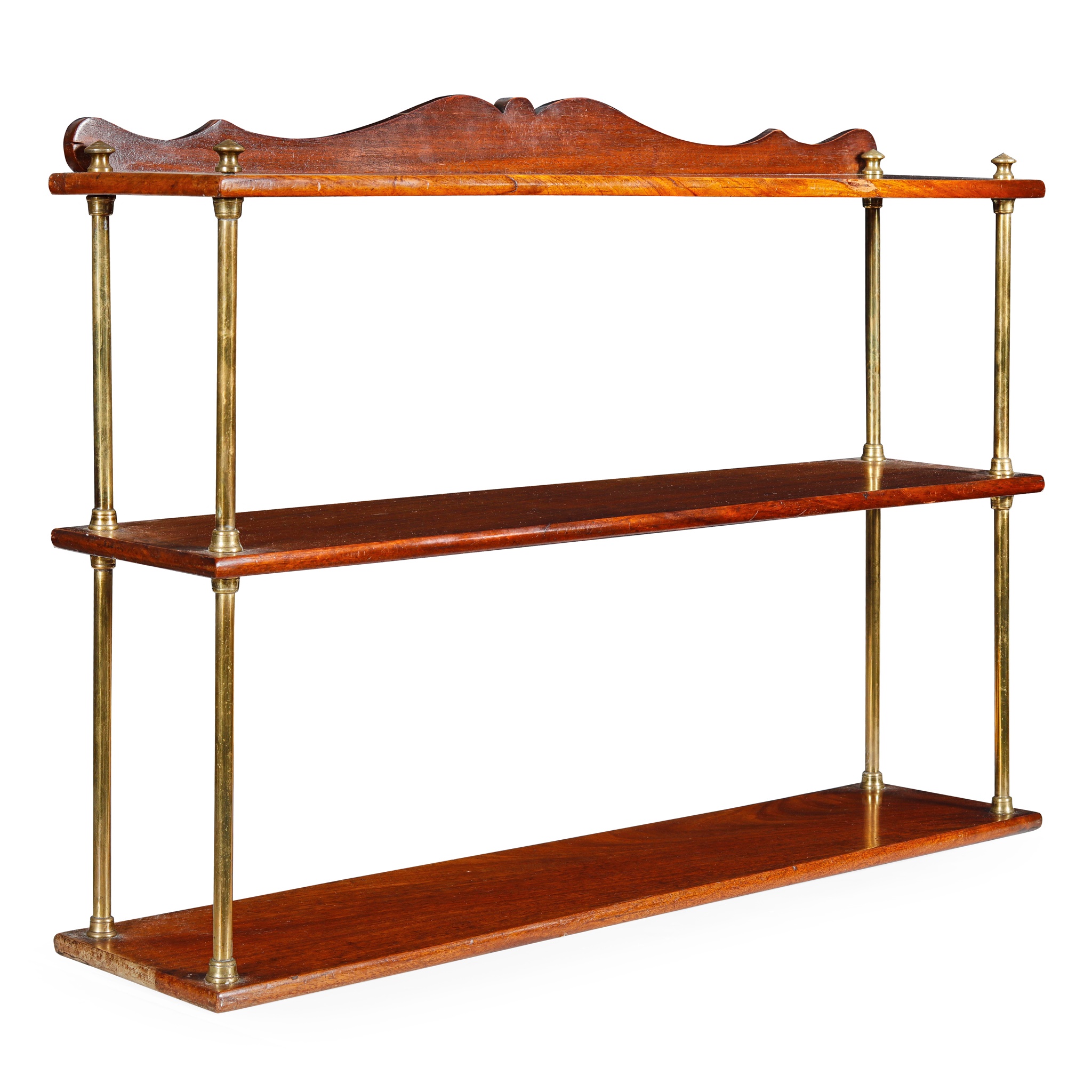 REGENCY MAHOGANY AND BRASS HANGING SHELVES