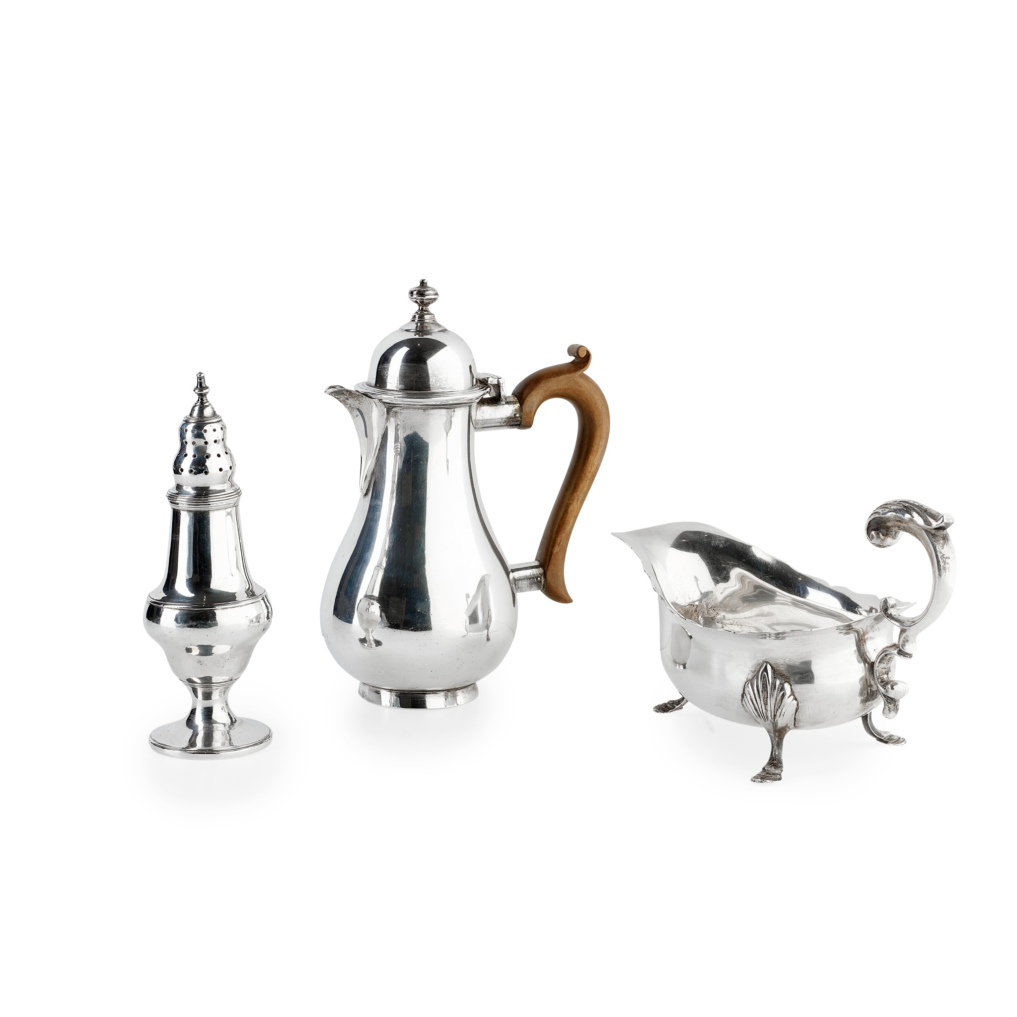 comprising: a coffee pot, in the plain 18th century style; a sauceboat, with wavy rim and scroll handle; and a George III caster, London 1804, of plain form with pierced pull off cover