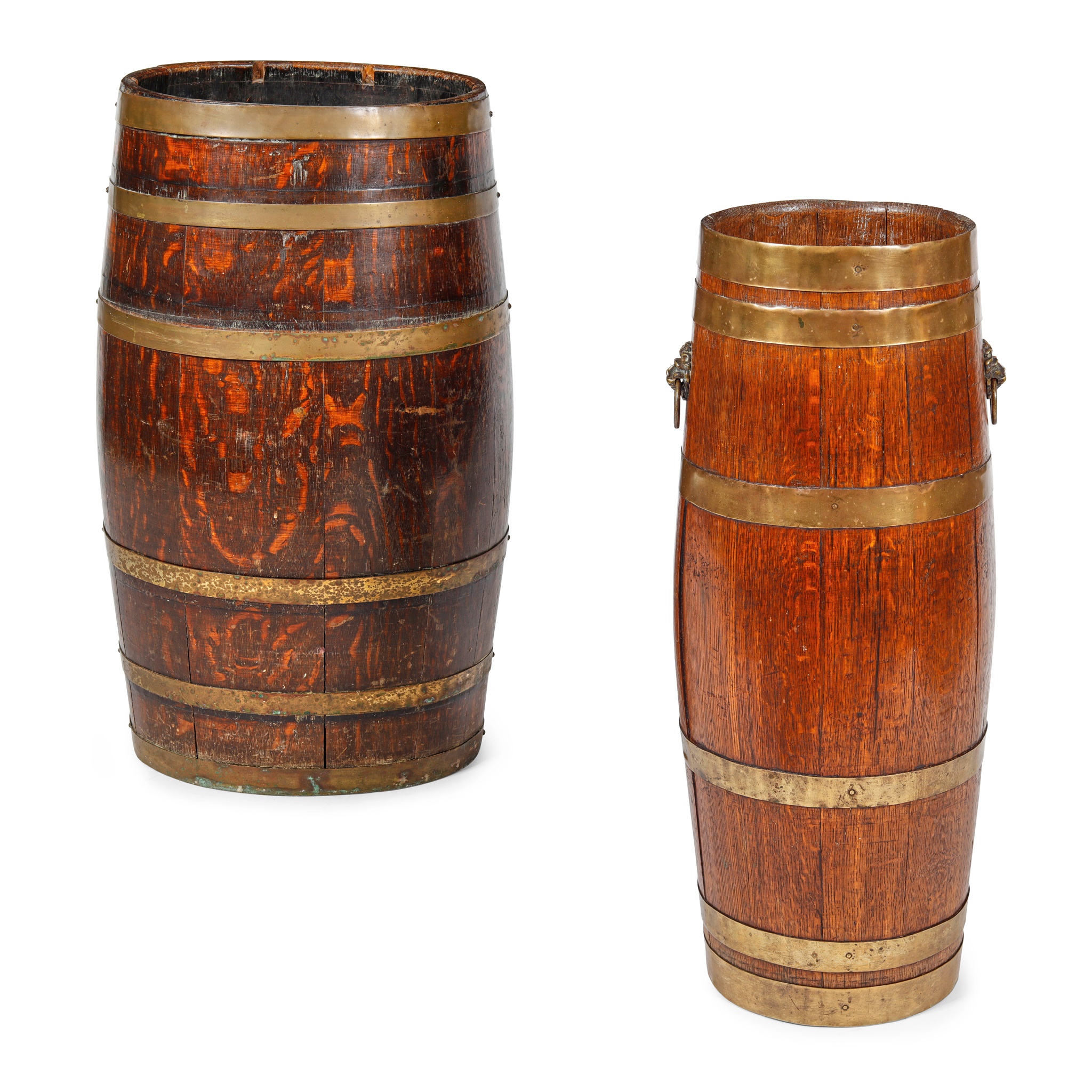 TWO OAK AND BRASS BANDED BARREL STICK STANDS