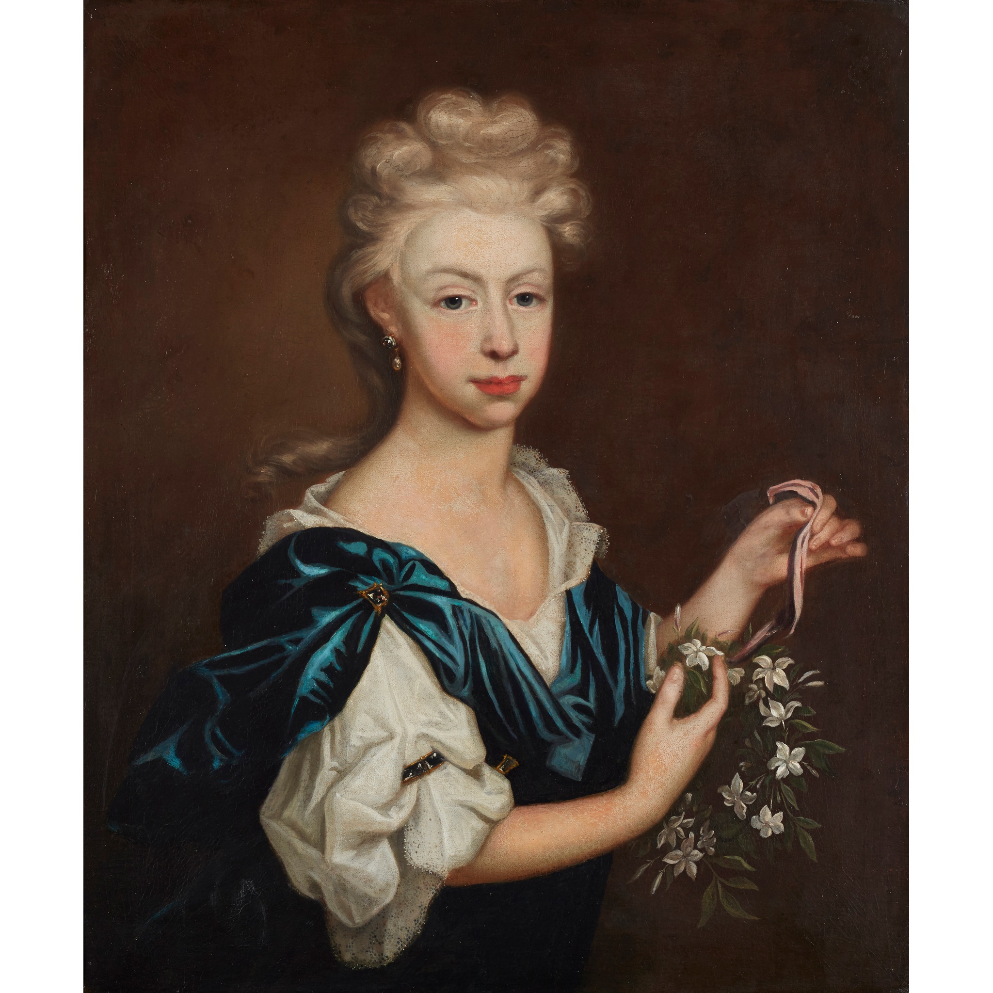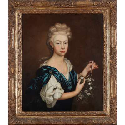 HALF LENGTH PORTRAIT OF A YOUNG WOMAN HOLDING A GARLAND OF FLOWERS