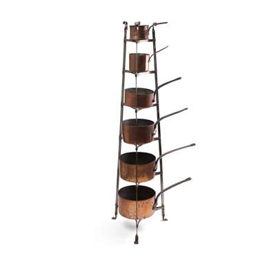 incuding: a batterie de cuisine on stand, pots and pans of various sizes, small boxes, etc.