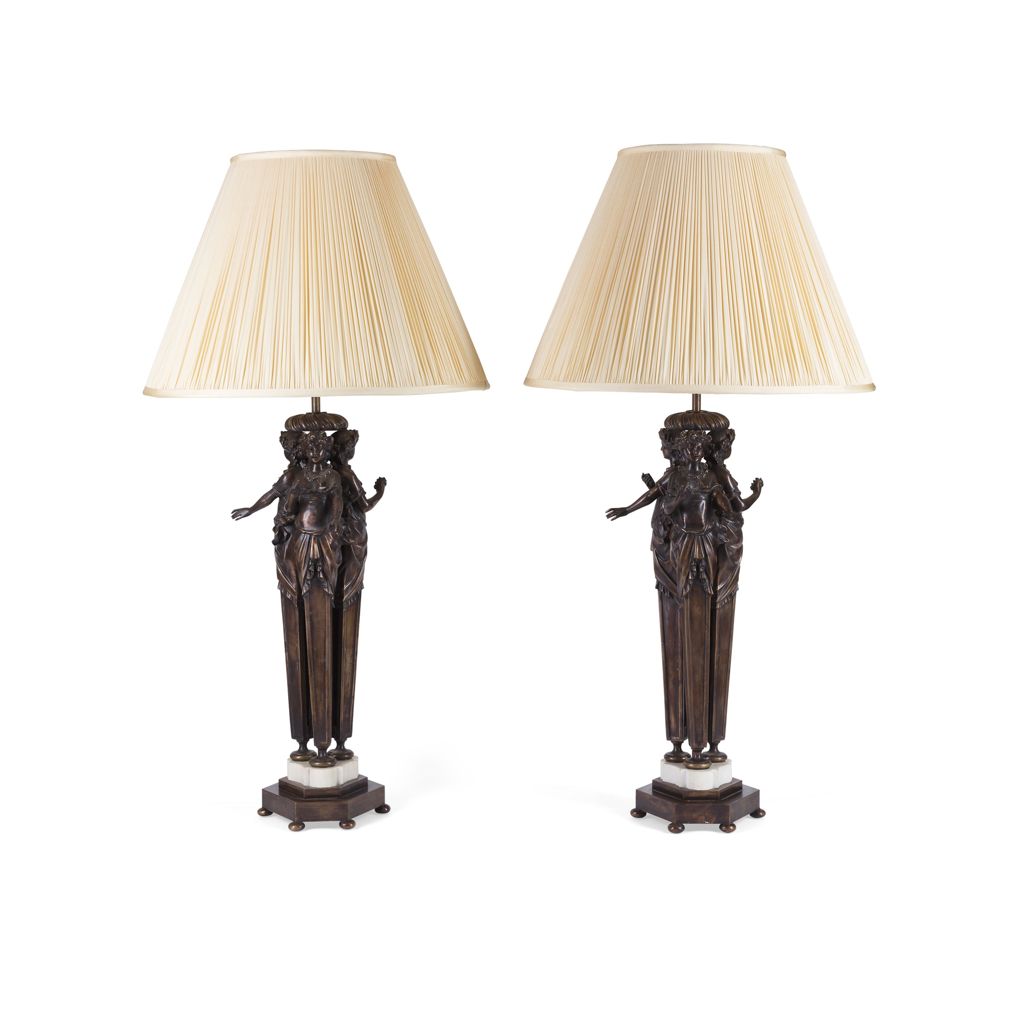 each with three caryatid maidens, on white marble and bronze stepped bases, fitted for electricity; with pleated shades