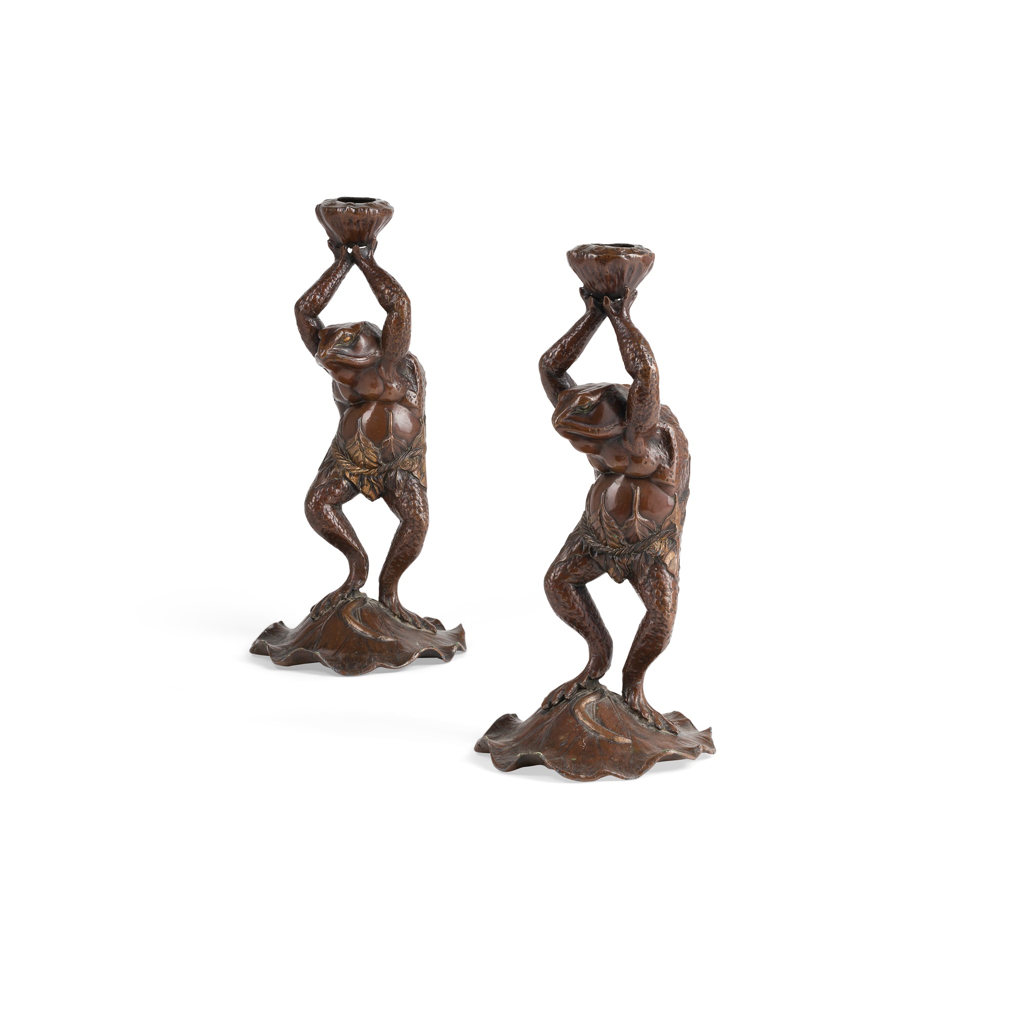 PAIR OF PATINATED BRONZE FROG CANDLESTICKS