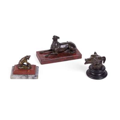 modelled recumbent, on a rouge marble base; together with ANOTHER BRONZE FIGURE OF A DOG, seated, on a stepped marble base; and a BRONZE DOG HEAD PAPERWEIGHT
