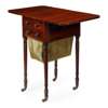 in the manner of Gillows, with drop leaf top, two drawers and a false drawer to the reverse, silk basket, on turned legs with brass caps and castors