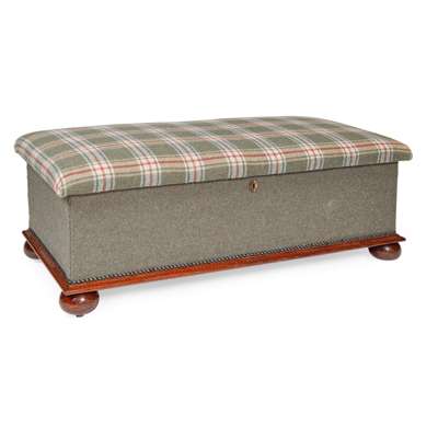 with tartan tweed upholstered padded top, tapered base in plain tweed, on a mahogany moulded base and squat ball feet