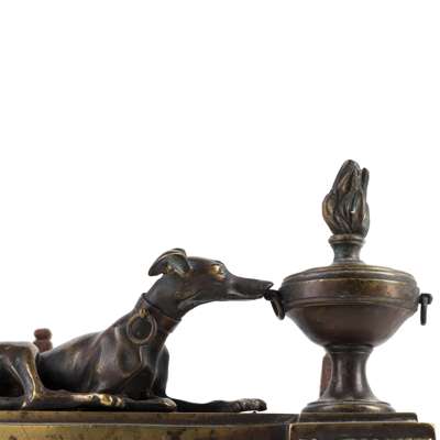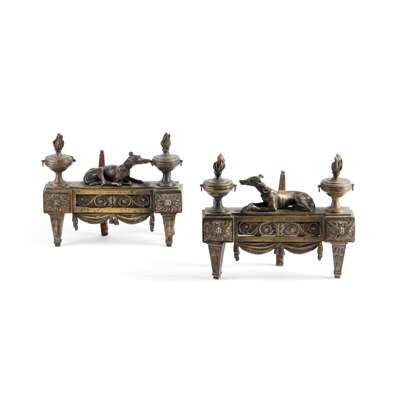 surmounted by figures of recumbent dogs flanked by burning lamps, over as moulded frieze and swags, raised on square tapered legs