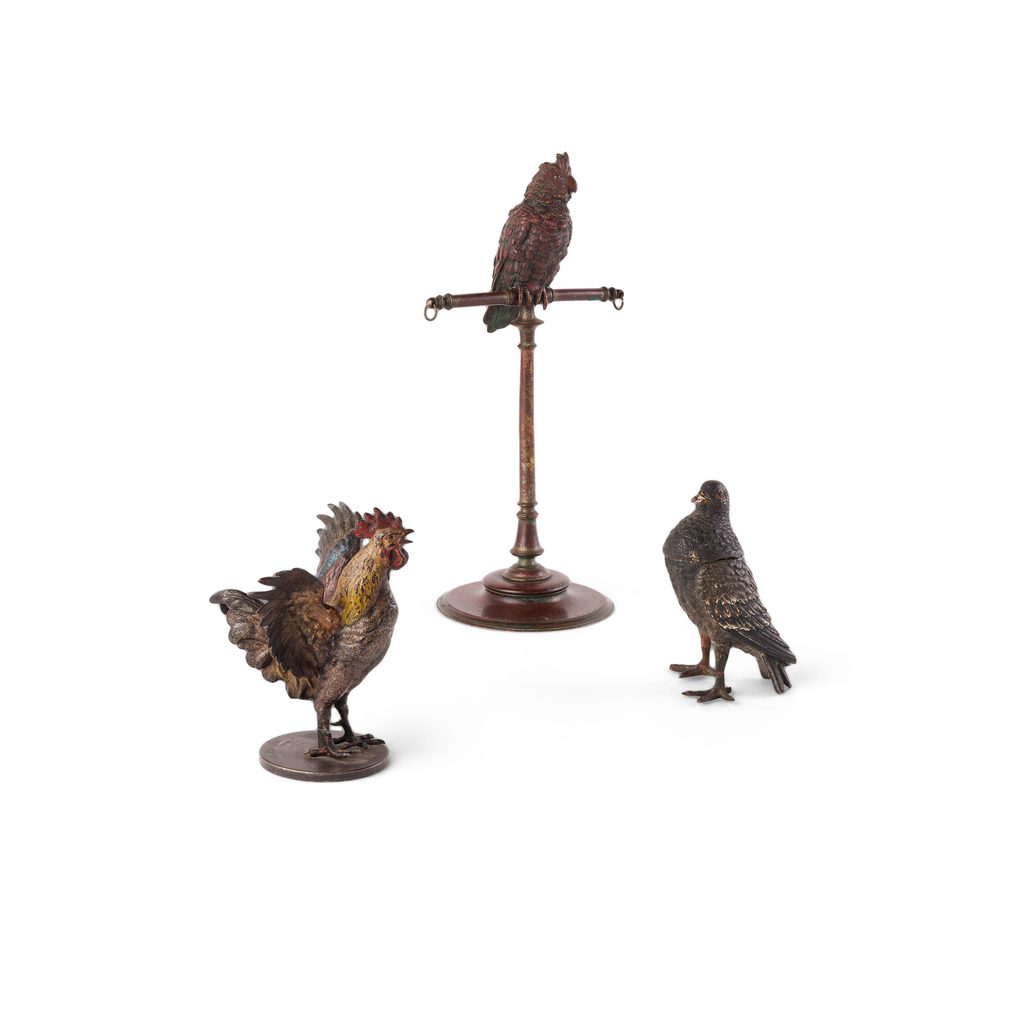 modelled standing with hinged head; together with a COLD PAINTED BRONZE COCKEREL; and a BRONZE PARROT ON PERCH