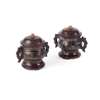 each decorated with taotie mask to each side, flanked with mythical beasts as handles, with pierced wood cover and associated wood stand