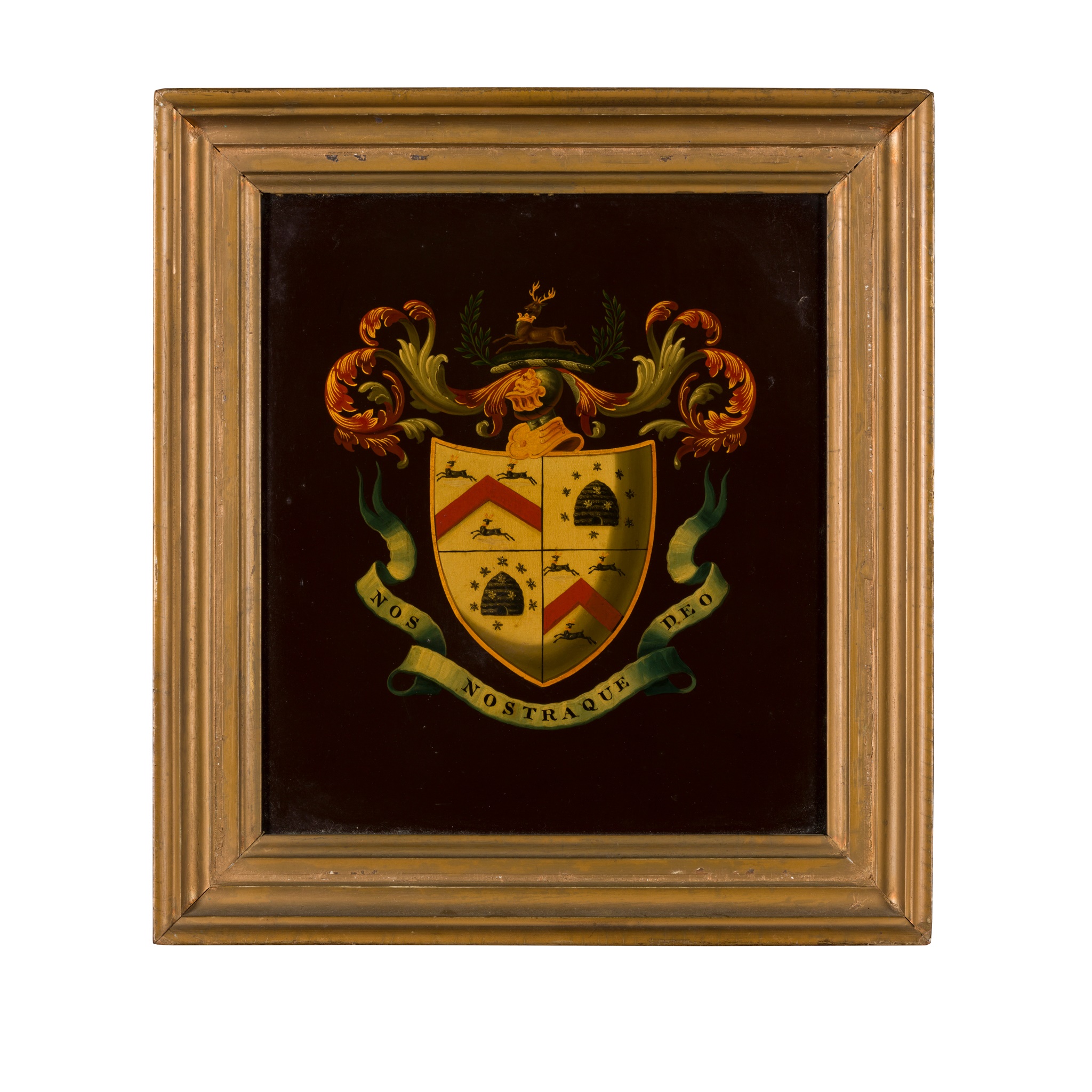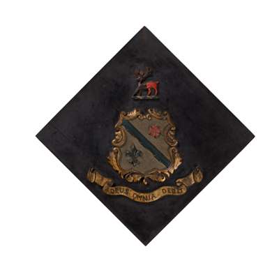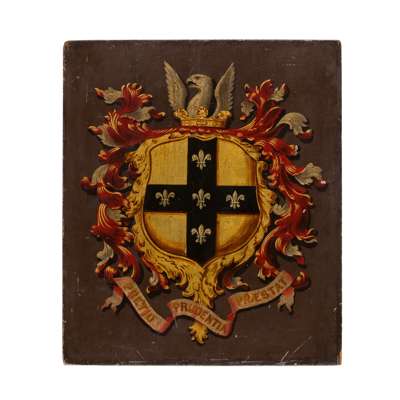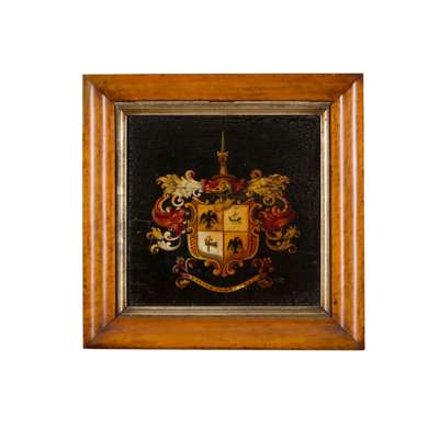 FOUR SMALL PAINTED WOOD ARMORIAL COACH PANELS