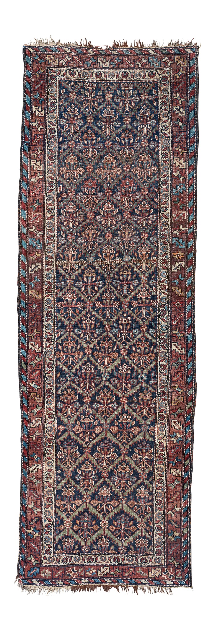 the indigo field with allover stylised foliate lozenge lattice pattern, within brown star and leaf border